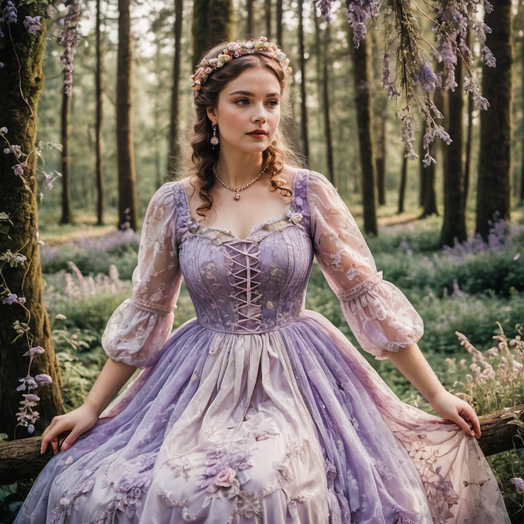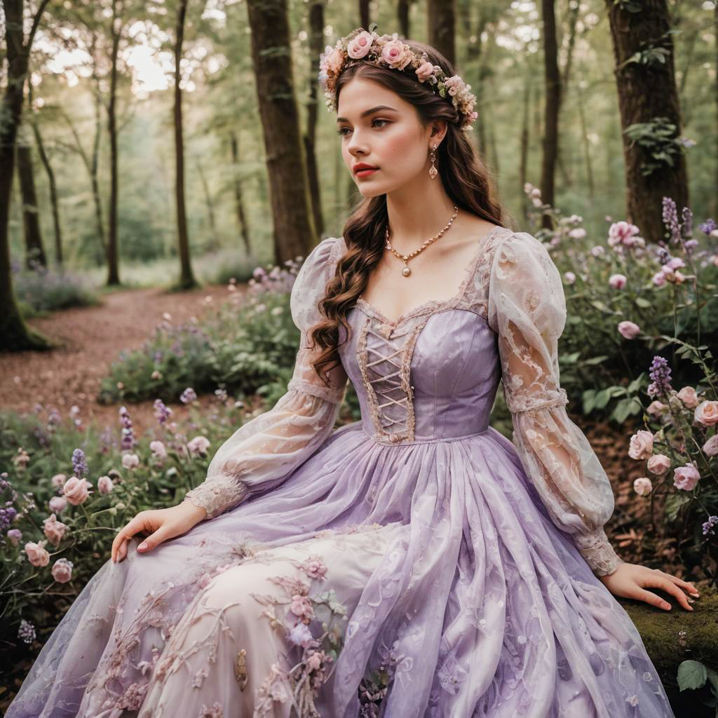 Portrait of a young woman wearing a pastel lavender vintage-style lace dress with delicate floral patterns and puffed sleeves. She has long dark hair styled with a braided crown and a flower wreath, accessorized with pearl jewelry. She is seated in a lush green forest surrounded by soft purple and pink flowers, conveying a romantic and delicate atmosphere.