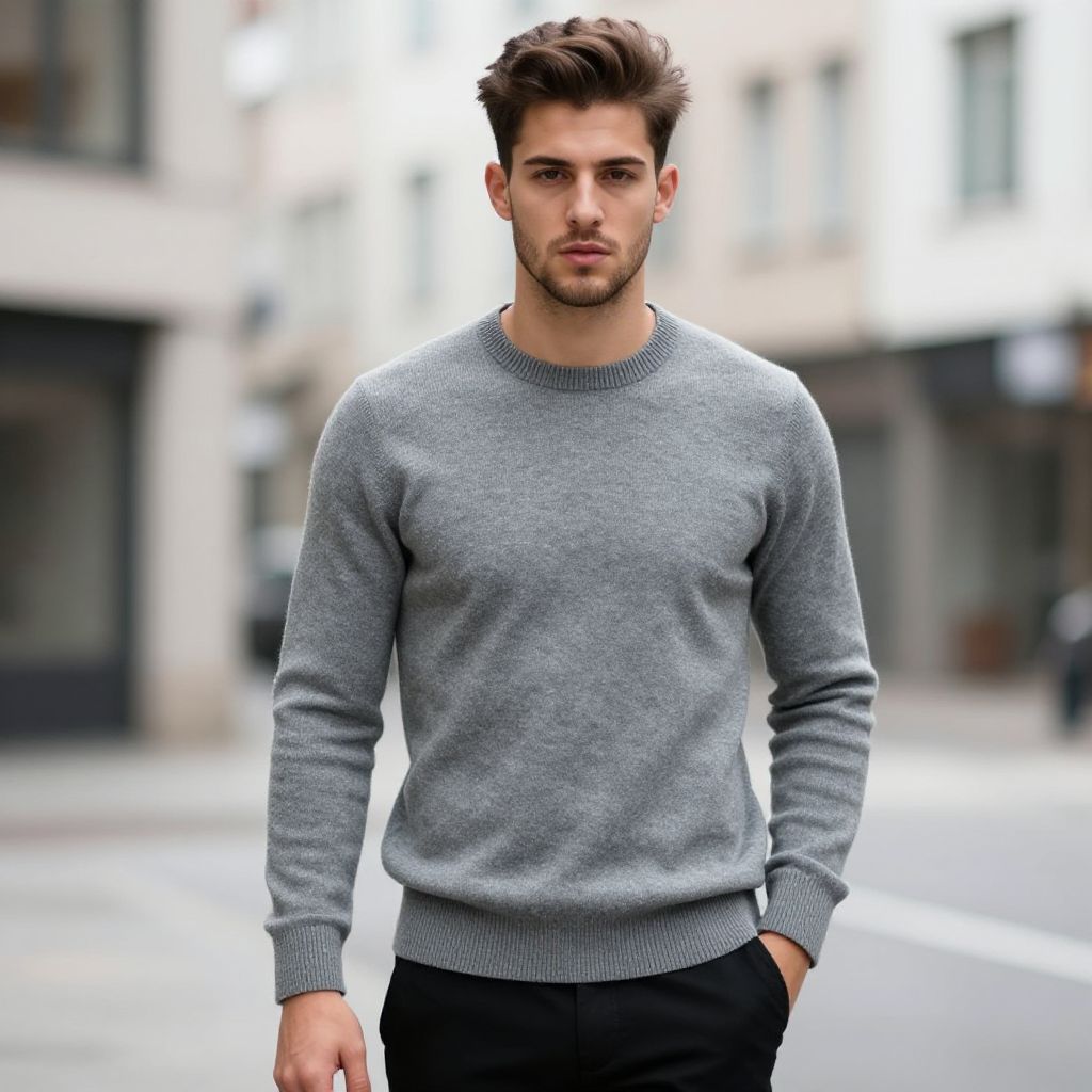 Photograph of a handsome, fit young man with short, styled brown hair and a light beard. He's wearing a fitted, gray crewneck sweater and black pants, with his right hand in his pocket. He stands on a city street with blurred buildings and windows in the background. His expression is serious and focused, and the overall style is casual and modern.