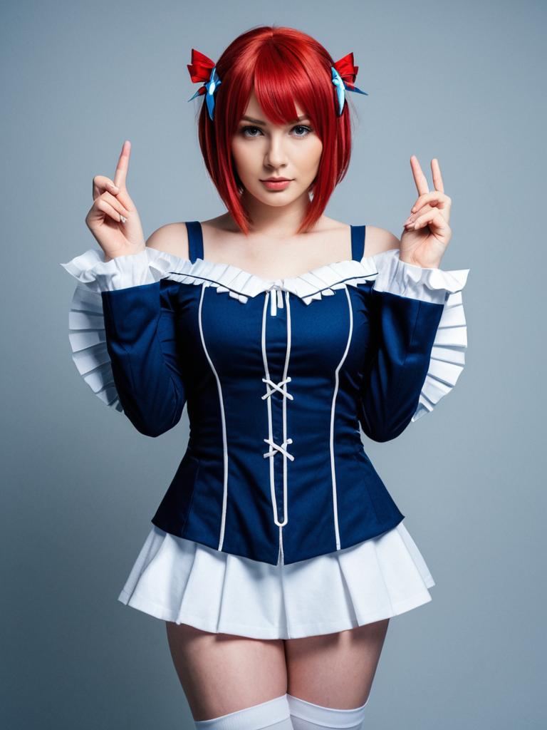 Photo-realistic cosplay photo of person in ange katrina (1st costume) costume. 1girl, blue eyes, hair between eyes, red hair, short hair, hair intakes, hairclip, long sleeves, off shoulder, virtual youtuber, virtual youtuber. full body shot