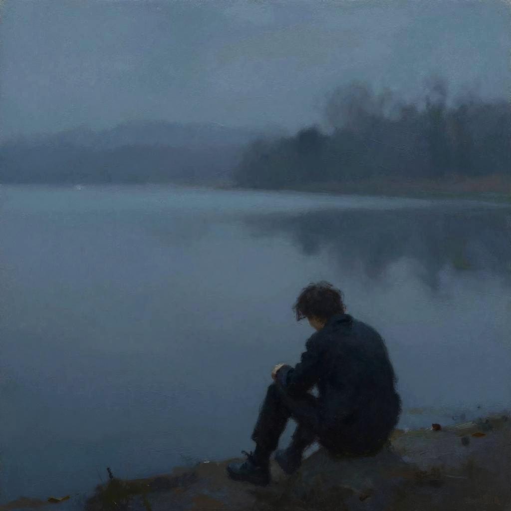Melancholic solitude painting of a lone figure sitting by a foggy lake at dusk, muted blues and grays, impressionist style, soft brush strokes, somber mood