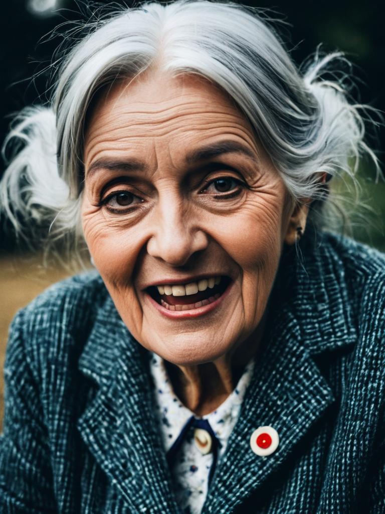 Woman in Crazy Old Lady Costume, photorealistic humorous cosplay portrait, cinematic realism