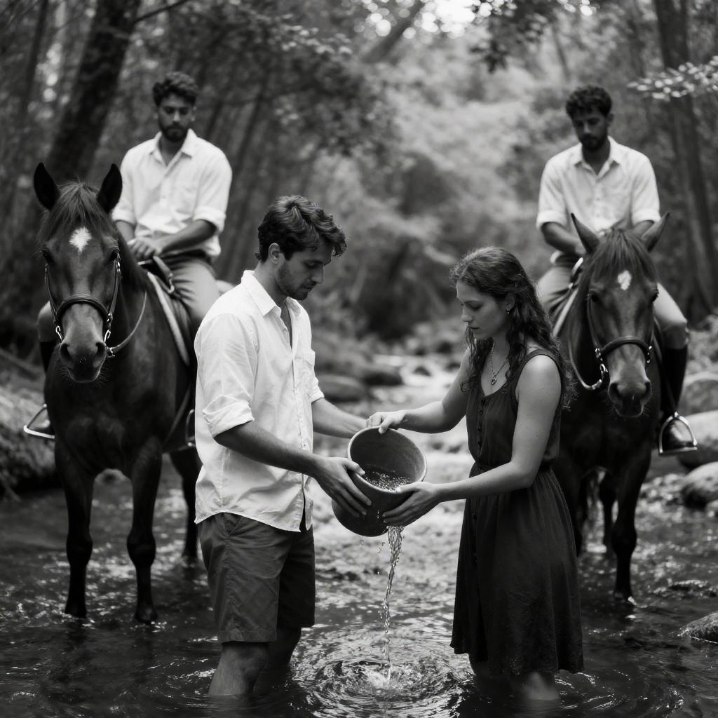 Black and white photograph. Three people in a forest stream with horses. Foreground: man in white shirt, woman in dark dress, horse. Background: another man, horse. Trees, light filtering through foliage. Woman holding bucket on horse's back. Horse in mid-stream. Interaction: woman pouring water into horse's bucket. Facial expressions: neutral. Setting: forest stream.
