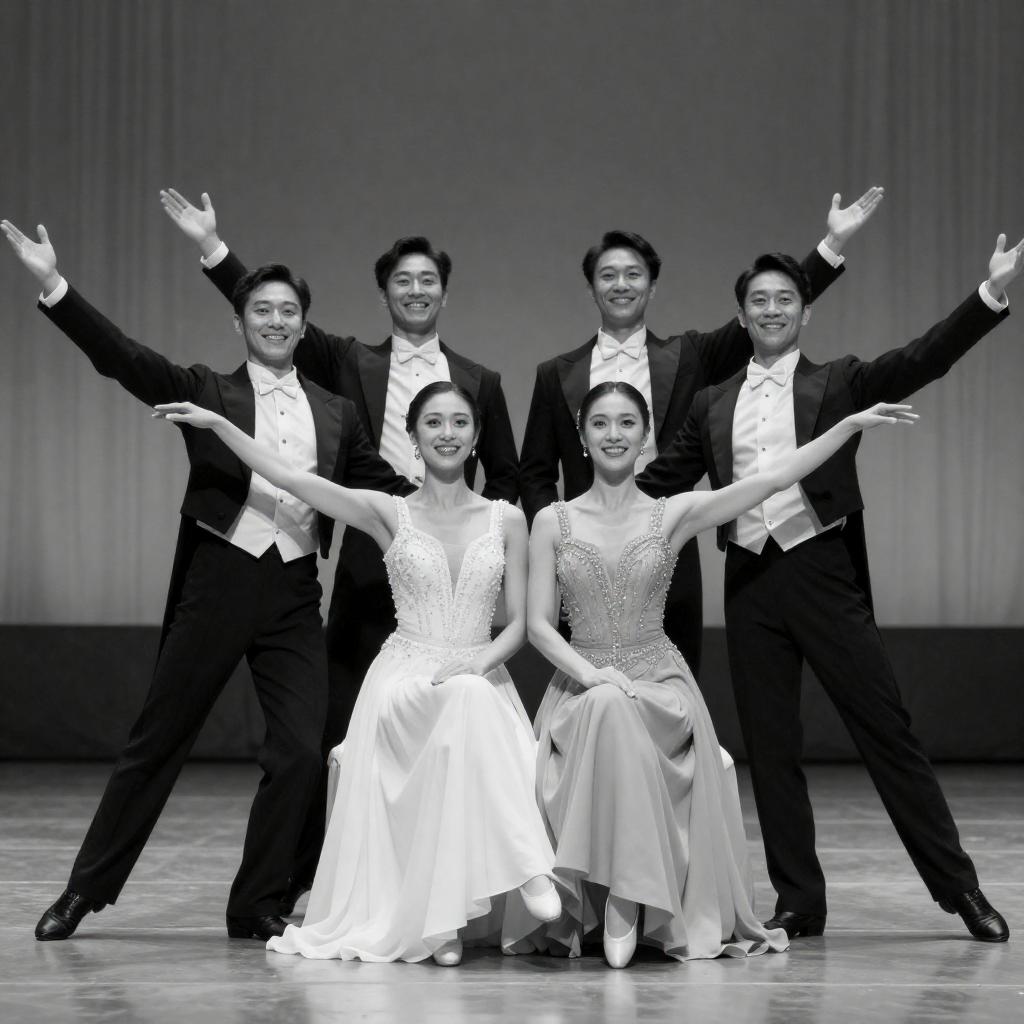 Photograph of a stage performance featuring nine women in various dresses, including white, red, and orange gowns, standing in a line. A man in a beige suit stands on the far left. The black backdrop is adorned with white stars, and red floral arrangements are on the stage floor.