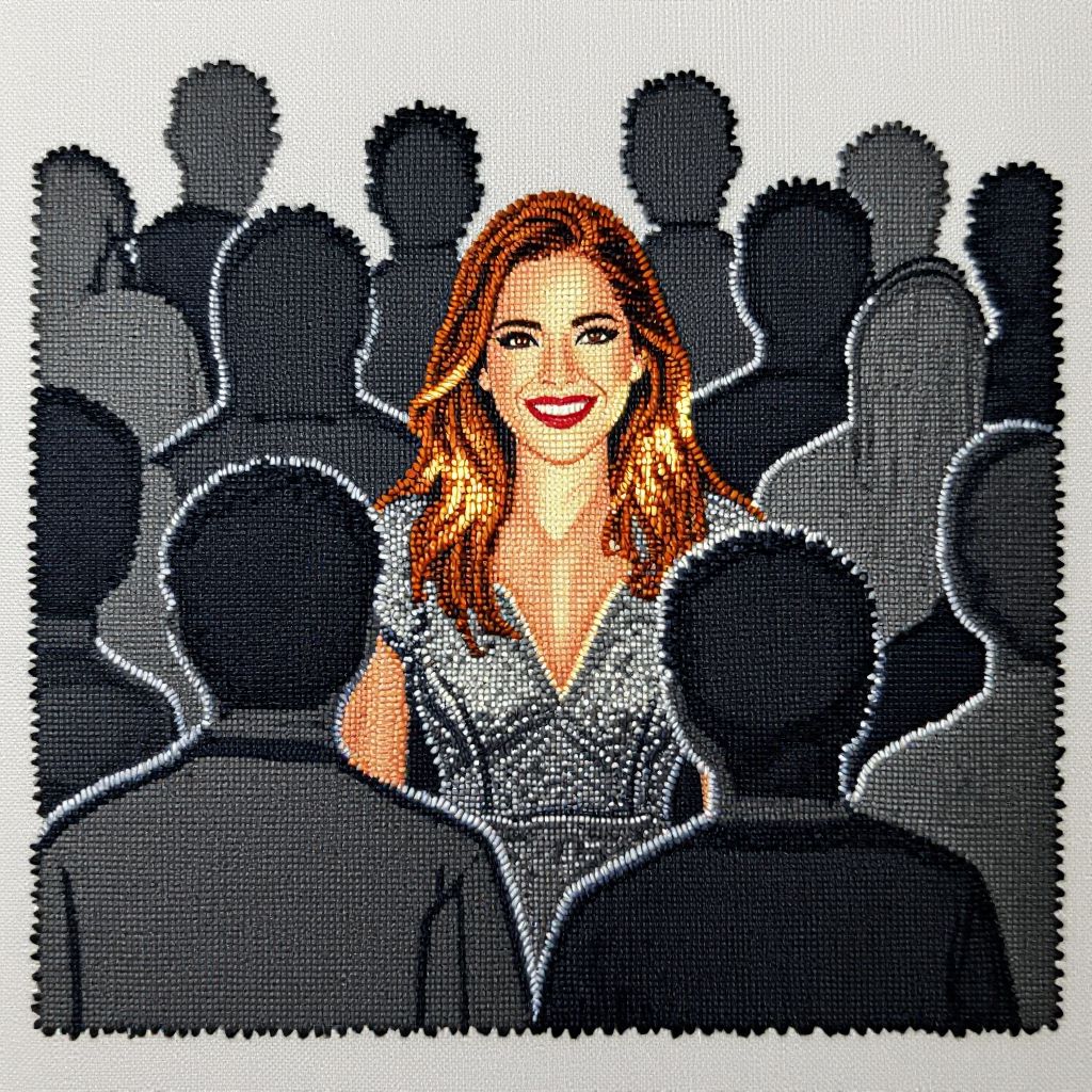 Colorful cross-stitch portrait of a smiling woman with red hair, wearing a sparkly dress, surrounded by silhouetted black crowd.