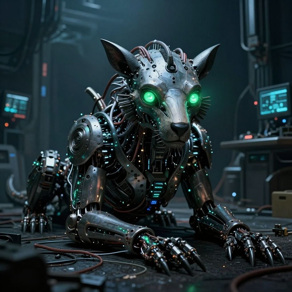 A highly detailed CGI image of a futuristic, robotic cat with metallic, cybernetic features. The cat is crouched on a dark, industrial floor, illuminated by dim, blue lighting. Its body is composed of shiny, silver metal with exposed wires and circuitry. The cat's eyes are vibrant green, glowing intensely. Its ears are pointed and metallic, matching the rest of its mechanical form. In the background, there are blurred, high-tech control panels with glowing blue screens. The overall scene has a sci-fi, dystopian atmosphere, with a focus on advanced technology and robotics.