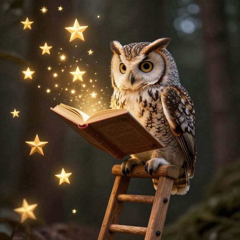 A wise owl perched on a floating wooden ladder, surrounded by a cascade of golden stars, intently reads an open book as if conjuring magic from its pages.