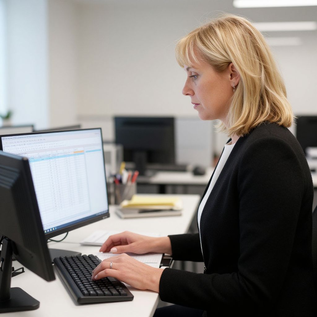 Photograph of a blonde Caucasian woman with shoulder-length hair and fair skin, wearing a black blazer over a white blouse, typing on a black keyboard at a white office desk. She is focused on two computer monitors, with one displaying a white text on a black background. The office background is blurred, featuring white walls, a black computer monitor, and various office supplies. The lighting is bright and even, emphasizing her profile. Her expression is neutral, and she wears small, gold earrings. The overall ambiance is professional and modern.