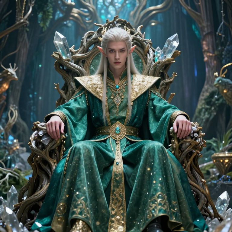 Digital artwork of an elven monarch with white hair, wearing a green, gold-embroidered robe, seated on a crystal-encrusted