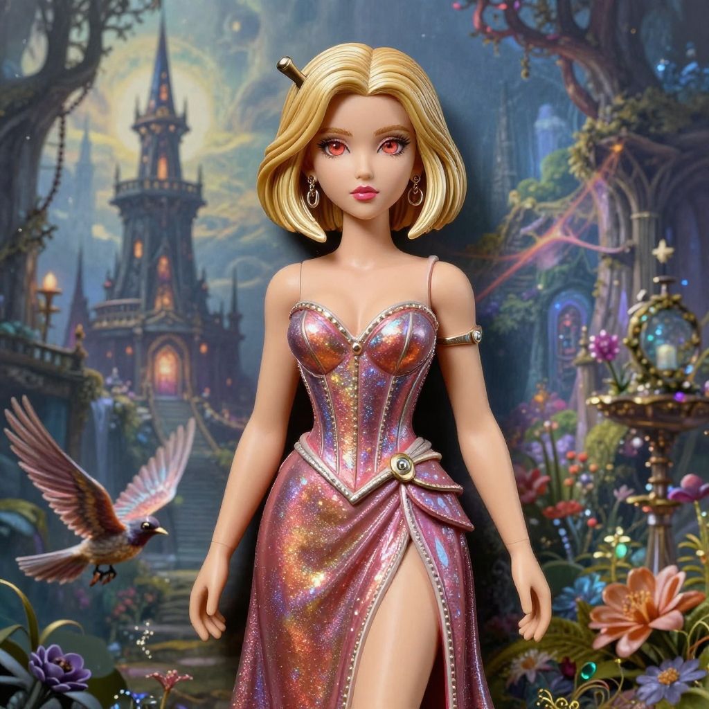 CGI image of a blonde anime-style woman with blue eyes, wearing a red puffy-sleeve dress, white gloves, and red heels,