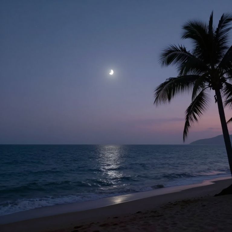 Photograph of a serene beach at twilight, featuring a silhouetted palm tree, moonlit ocean, and a reflective shoreline.