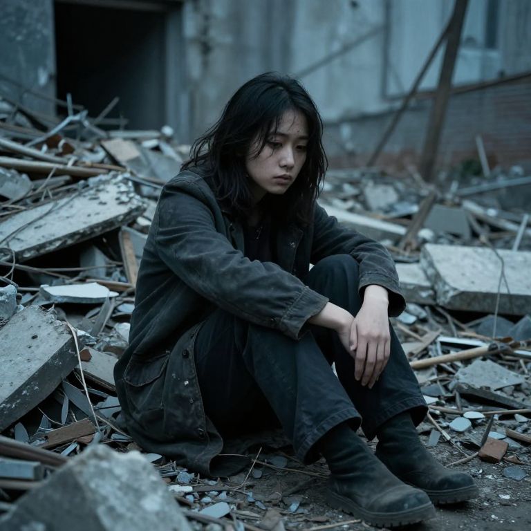 Thousand yard stare art showing a lone figure sitting amidst rubble, eyes unfocused and vacant, cold color palette with blues and grays, detailed textures emphasizing weariness and loss, soft, moody lighting creating an atmosphere of despair and reflection.