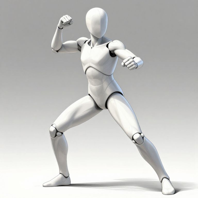 A digital rendering of a white, featureless, humanoid mannequin in a dynamic fighting stance. The mannequin has a smooth, metallic texture with black joints at the elbows, knees, and ankles. It stands with legs apart and one arm raised in a fist, the other arm extended forward. The background is a gradient from light gray at the top to white at the bottom, emphasizing the mannequin's form. The lighting creates subtle shadows, adding depth to the figure's contours. The overall style is minimalist and modern, focusing on the mannequin's pose and structure.