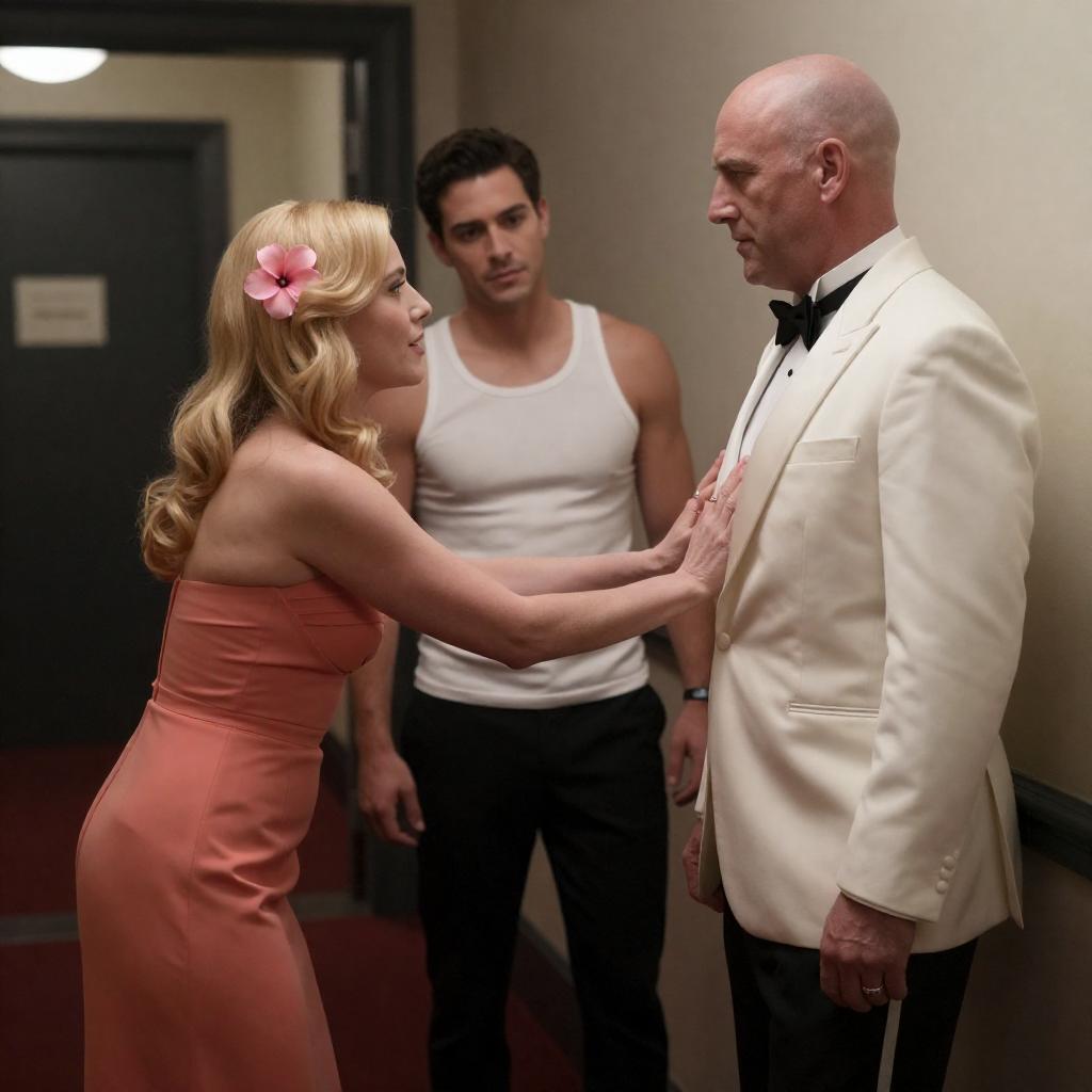 Photograph of a dramatic scene: a bald man in a brown suit with a red tie points accusingly at a blonde woman in a white, frilled dress holding a black handgun. They stand in a dimly lit room with a bookshelf and framed portrait in the background. The woman's expression is intense.