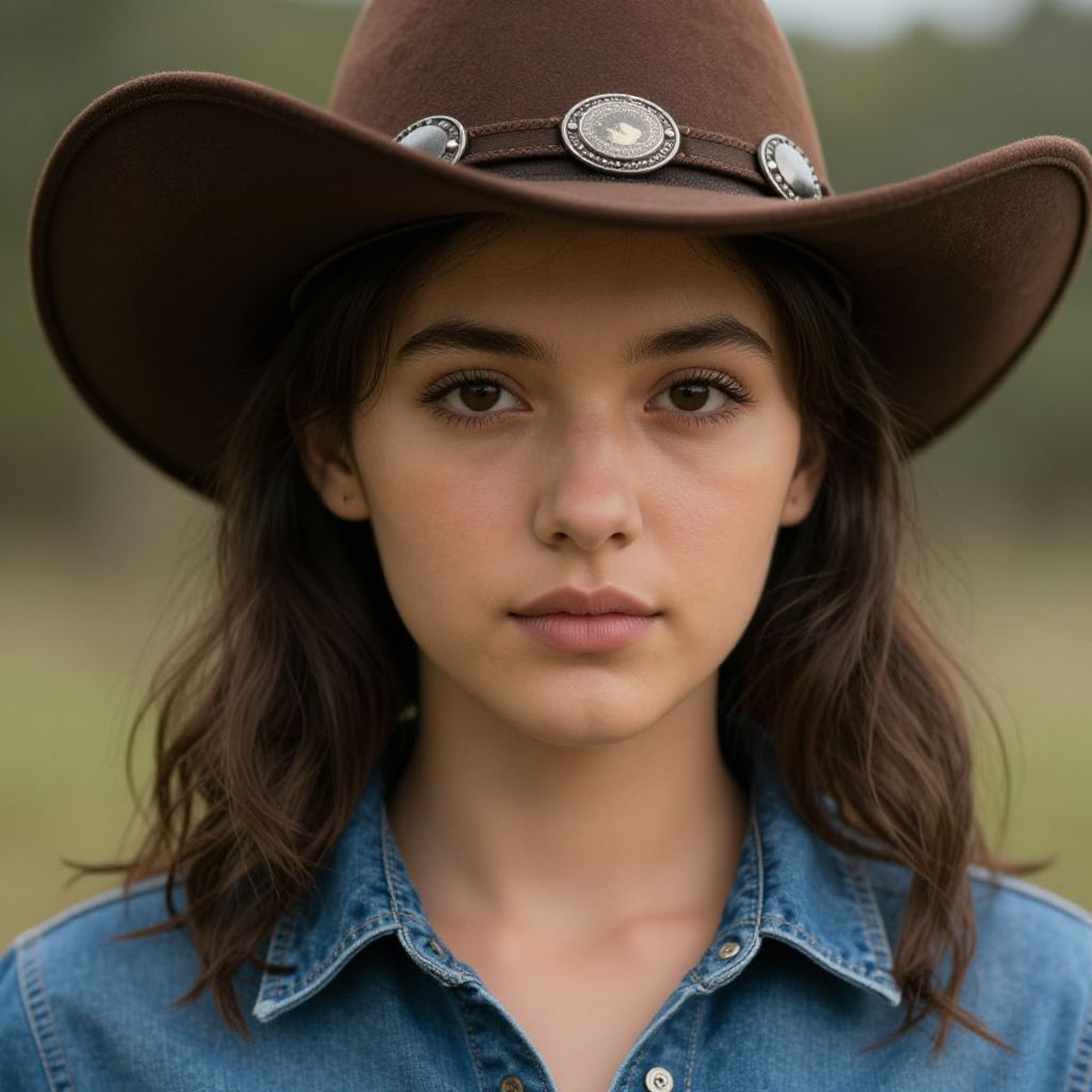 Young woman with fair skin, brown eyes, and wavy dark hair wears a brown cowboy hat with silver accents, and a blue denim shirt, in