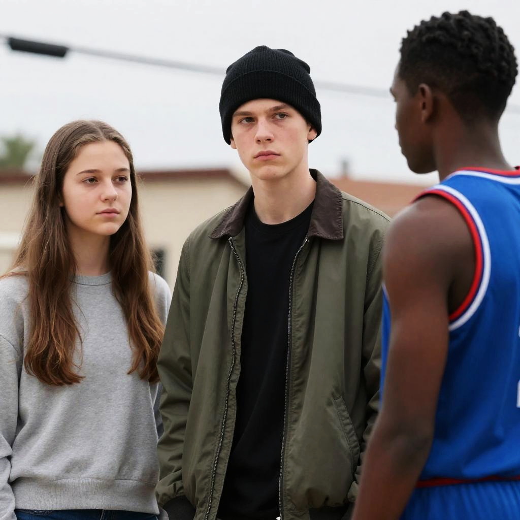 Photograph of two young men seated on a bus. The man on the left has dark skin, a shaved head, and wears a maroon t-shirt. The man on the right has light skin, short blond hair, wearing a gray hoodie over a white t-shirt. Both appear thoughtful or neutral, with other passengers visible in the blurred background.