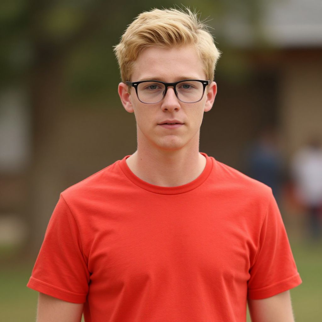 Photograph of a young, fair-skinned man with blonde hair, black-framed glasses, and a red t-shirt, standing outdoors with a blurred
