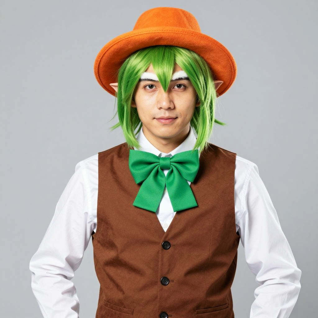 A man dressed in a photorealistic Oompa Loompa costume poses in a studio portrait. The detailed cosplay features bright green hair, white eyebrows, an orange hat, and a brown vest accented with a green bow tie, capturing the whimsical essence of the character.