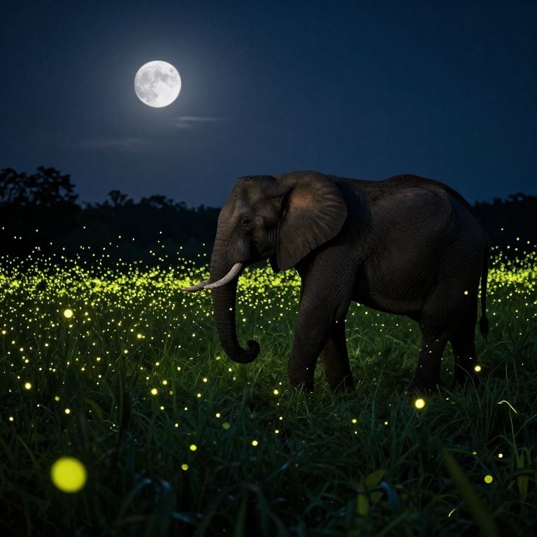 Elephant beautiful photo of glowing fireflies in a field, full moon, ethereal, haunting, cinematic lighting, panoramic view, depth if field, shot woth slr camera, v 5,
