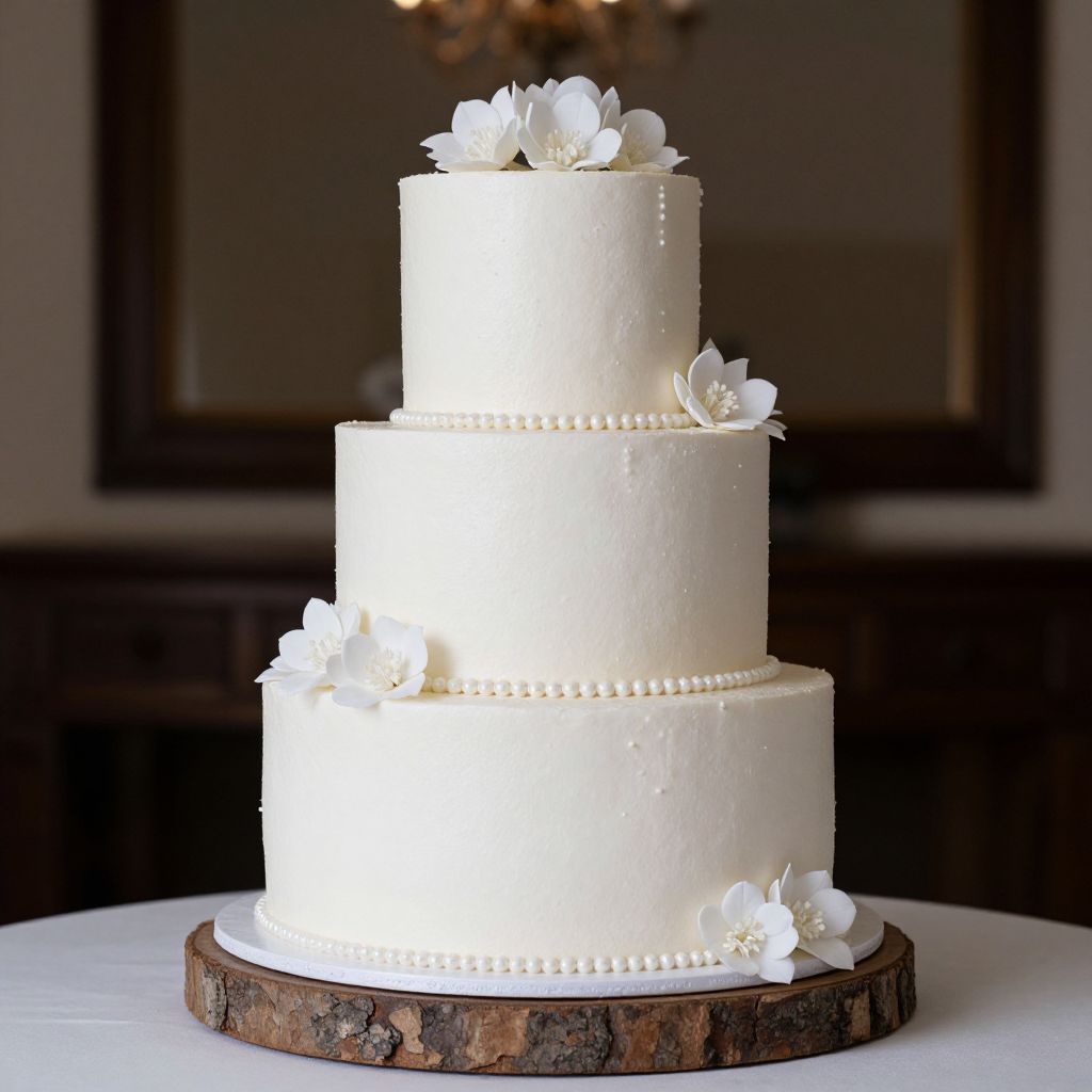 Elegant three-tiered wedding cake featuring smooth white frosting, vertical pearl accents, and delicate white floral decorations atop each tier, presented on a rustic wooden base with a white circular plate beneath.
