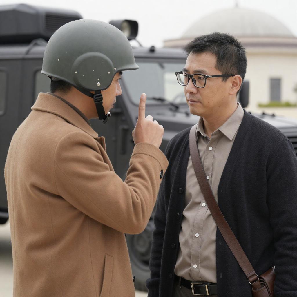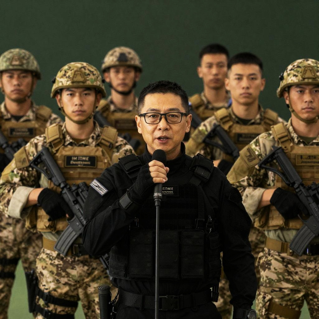 Photograph of six soldiers in a row. Front soldier, middle-aged, wearing black tactical gear, glasses, and multiple badges, speaks into a microphone. Five other soldiers in the background, wearing camo and tactical gear, hold rifles. Dark green, yellow-tinted lighting. Intense expressions.