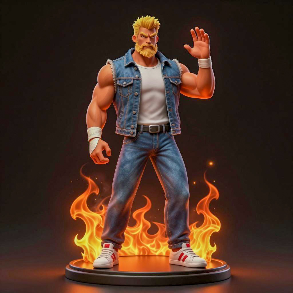 Muscular blonde man with beard, white shirt, denim vest, and jeans. His hands and feet surrounded by orange fire. White sneakers with red stripes. Standing on a circular base with flames. Right hand raised, left hand slightly lowered. Black background. Digital illustration. His intense expression matches the fiery aura. One white bandage on his left wrist. Full body pose.