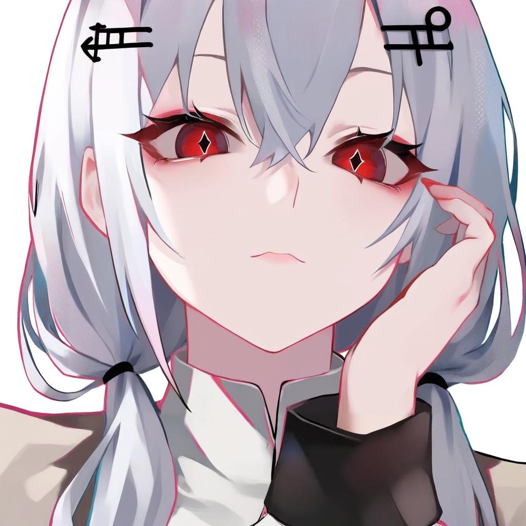Hakase fuyuki, nijisanji, 1girl, red eyes, hair between eyes, grey hair, long hair, low twintails, hairclip, large breasts, white shirt, long sleeves, virtual youtuber, virtual youtuber, by artist tamago (yotsumi works), animagine