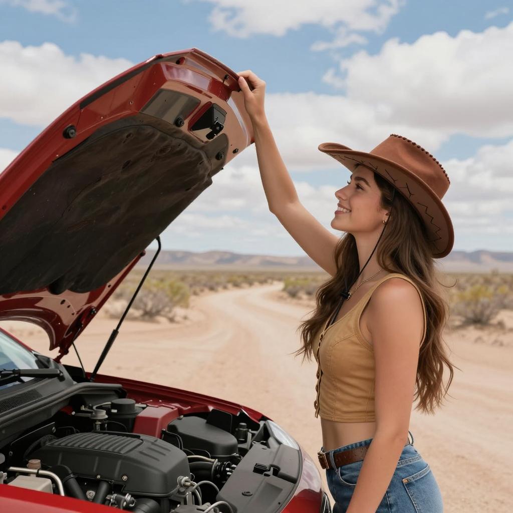 Sexy busty woman in car, seated in compact hatchback with sporty bucket seats wearing off-the-shoulder top with skinny jeans and ankle boots on woman with dyed pastel hair and winged eyeliner, slouched slightly with both hands on the wheel, expression introspective in industrial zone with warehouses and utility poles under dramatic sunset light streaming through the windshield, orange glow on hair, captured from angled view from behind the driver seat looking forward, cinematic atmosphere, shallow depth of field, ultra-detailed