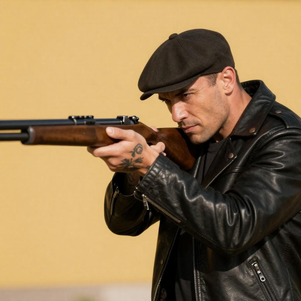 Photograph of a muscular man in a black leather jacket and flat cap, aiming a rifle with both hands. He has tattoos on his arms and a focused expression. The background is a bright, yellowish, ured wall. The image has a high-contrast, dramatic lighting effect.