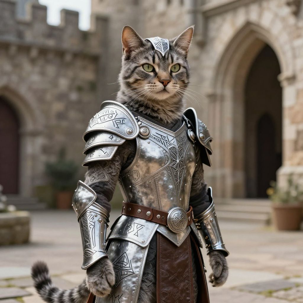 Fantasy cat body armor crafted from enchanted silver and leather, ornate patterns with mystical runes, feline warrior ready for battle in a medieval castle courtyard, soft sunlight filtering through ancient stone walls, highly detailed, photorealistic textures