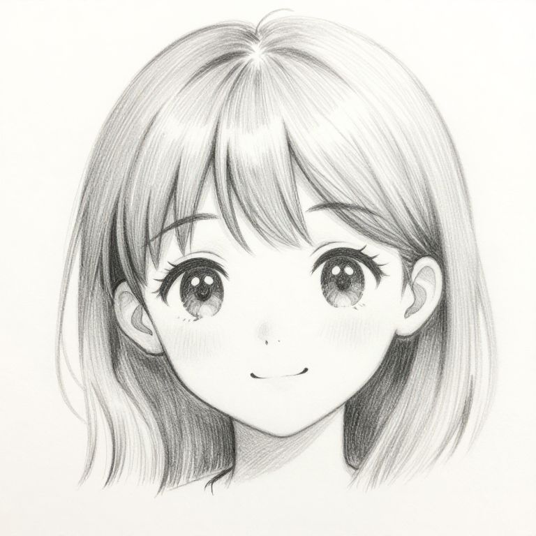 Pencil cute anime girl drawing, minimalist background, close-up of face with large expressive eyes and gentle smile, delicate pencil shading on hair and facial features, subtle texture adding depth, soft and heartwarming character design.