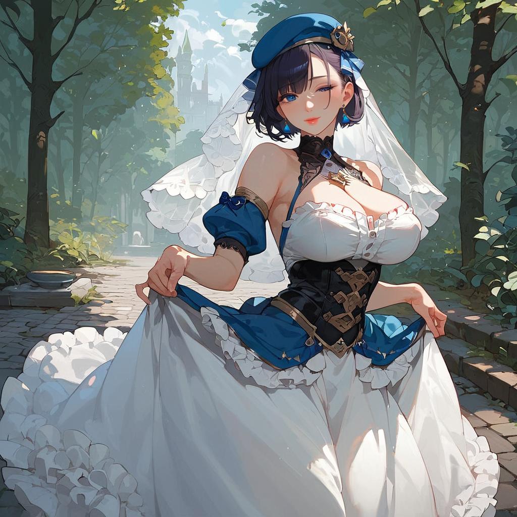 Score_9, score_8_up, score_7_up, score_6_up, source_anime, 1girl, blue eyes, short hair, beret, veil, see-through, earrings, frilled dress, center frills, corset, long dress, big breasts, skirt hold, looking at viewer, smile, bending forward, outdoors, cobblestones, forest