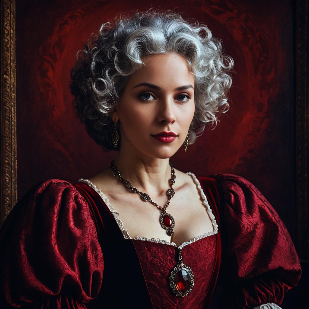 Detailed portrait of a woman with silver curly hair wearing a deep red vintage Renaissance-style dress with puffed sleeves. She is adorned with a large pendant necklace and earrings. The dramatic chiaroscuro lighting highlights her face and shoulders against a rich, textured, dark warm-toned background, featuring warm red and purple hues.