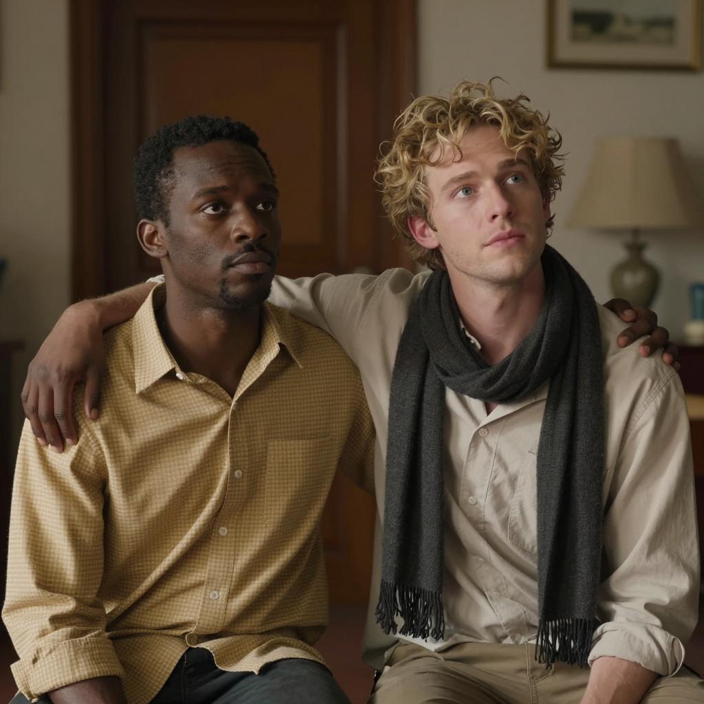 Two men sit close together in a dimly lit room. The man on the left is dark-skinned with short black hair, wearing a yellow checkered shirt. The man on the right is light-skinned with blonde, curly hair, wearing a beige shirt and dark scarf. The man on the right has his arm around the man on the left's shoulder. The man on the left looks to his left, while the man on the right looks slightly upward. Background includes wooden furniture and a lamp.