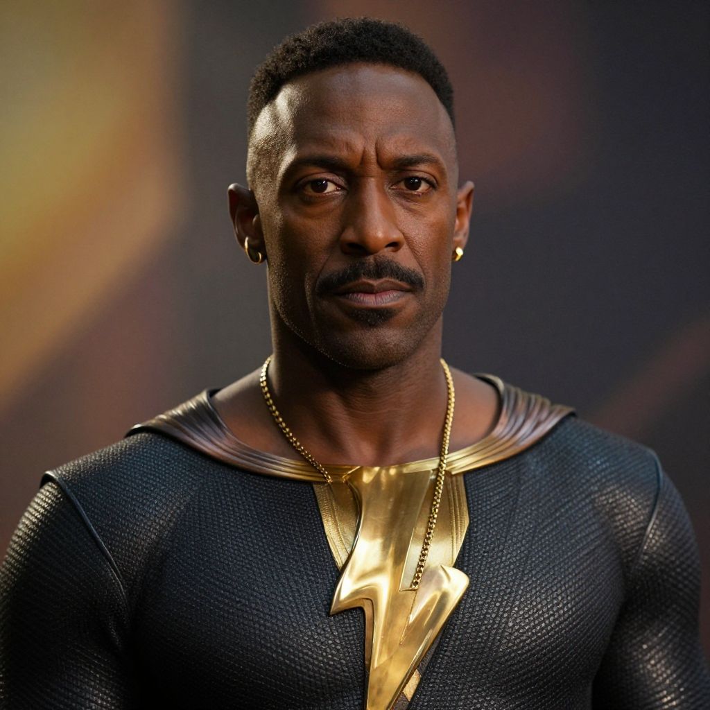Black adam costume adult, 1boy, male focus, solo, facial hair, jewelry, beard, dark skin, necklace, dark-skinned male, black hair, realistic, looking at viewer, mustache, earrings, toga, blurry background, blurry