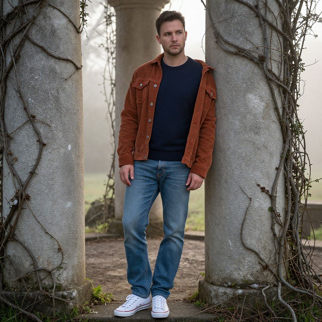 A man, navy crew-neck sweater, medium wash jeans, white canvas sneakers, rust-colored corduroy jacket, relaxed pose, crumbled stone pillars, overgrown vines, misty morning light, contemplative expression, soft focus. Man has masculine face and piercing eyes