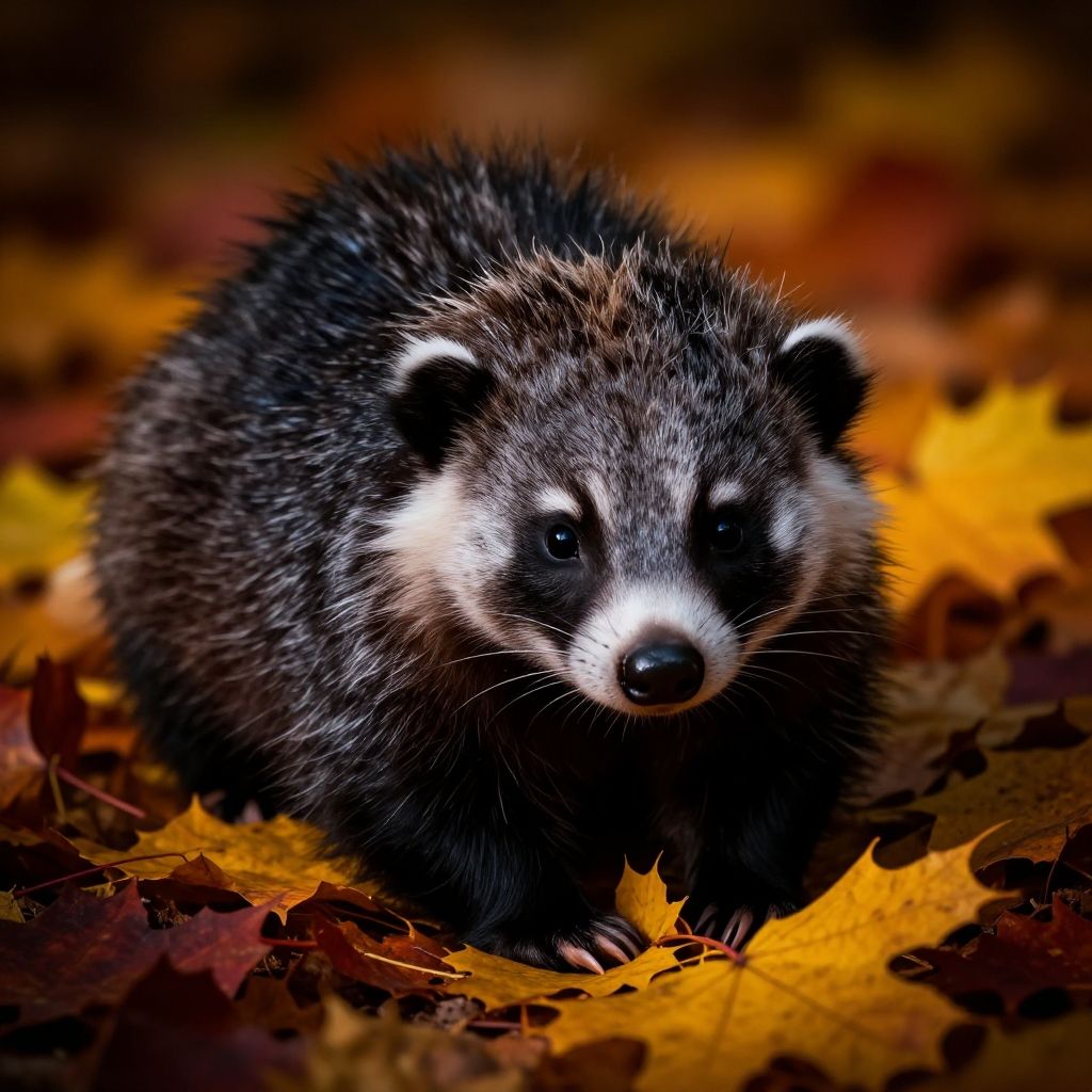 Photograph of a European badger standing amidst an autumn forest floor. The badger has a black and white striped face, with white stripes over its black eyes, and a black nose. Its fur is dense and black with a slightly glossy texture. The background is filled with vibrant orange and yellow fallen leaves, contrasting with the badger's dark fur. The lighting highlights the badger's face, making it the focal point of the image. The overall composition emphasizes the seasonal beauty and the badger's natural habitat.