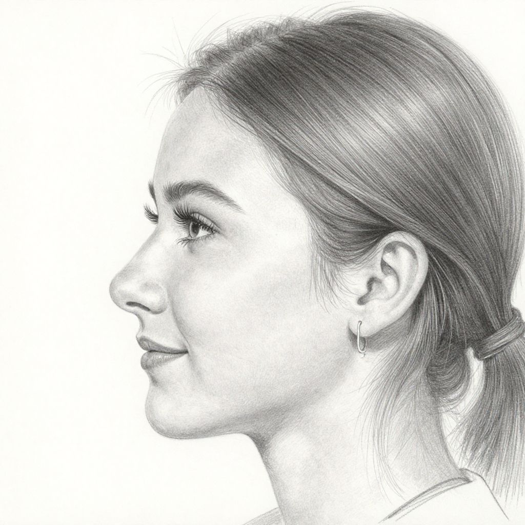 This is a detailed black and white pencil drawing of a young woman in profile, facing left. She has light skin, straight hair pulled back into a simple ponytail, and wears a subtle smile. Her eyes are softly closed, and she has small, delicate earrings in both ears. The texture of the pencil strokes is visible, adding depth to her hair and facial features. The background is completely white, making her profile the focal point. The style is realistic, capturing the natural beauty and calm expression of the subject.
