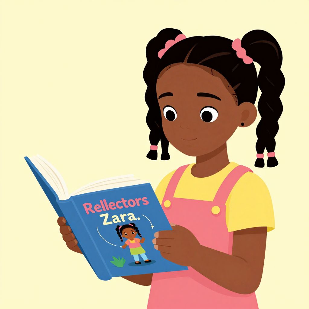 "Reflectors Zara is a cute 7 year old, African American girl, Braids, childrens book illustration, 2D, vector, flat,"