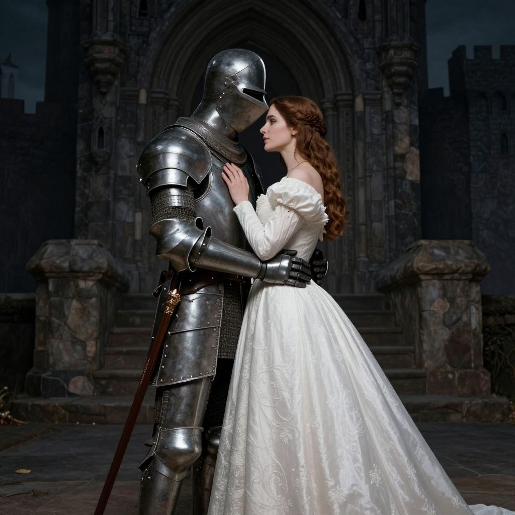A digitally rendered image depicts a romantic scene between a knight in shiny, reflective silver armor and a woman in an off-shoulder, white, lace-trimmed wedding gown. They stand close, gazing into each other's eyes, with the knight's hand gently holding the woman's waist. The background features a dark, gothic cathedral with detailed stone architecture. The woman's long, wavy brown hair cascades over her shoulders, contrasting with the knight's metallic armor. The image exudes a medieval fairy-tale atmosphere, blending romance and fantasy elements.
