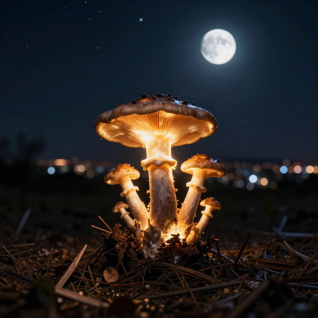 Photorealistic image of glowing fungi growing on contaminated ground at night. The mushrooms emit a warm light, contrasting with the dark surroundings and a bright full moon in the sky. The intricate details of the mushrooms' gills and stems are highlighted, with bokeh city lights visible in the background, creating a mystical and cinematic mood.
