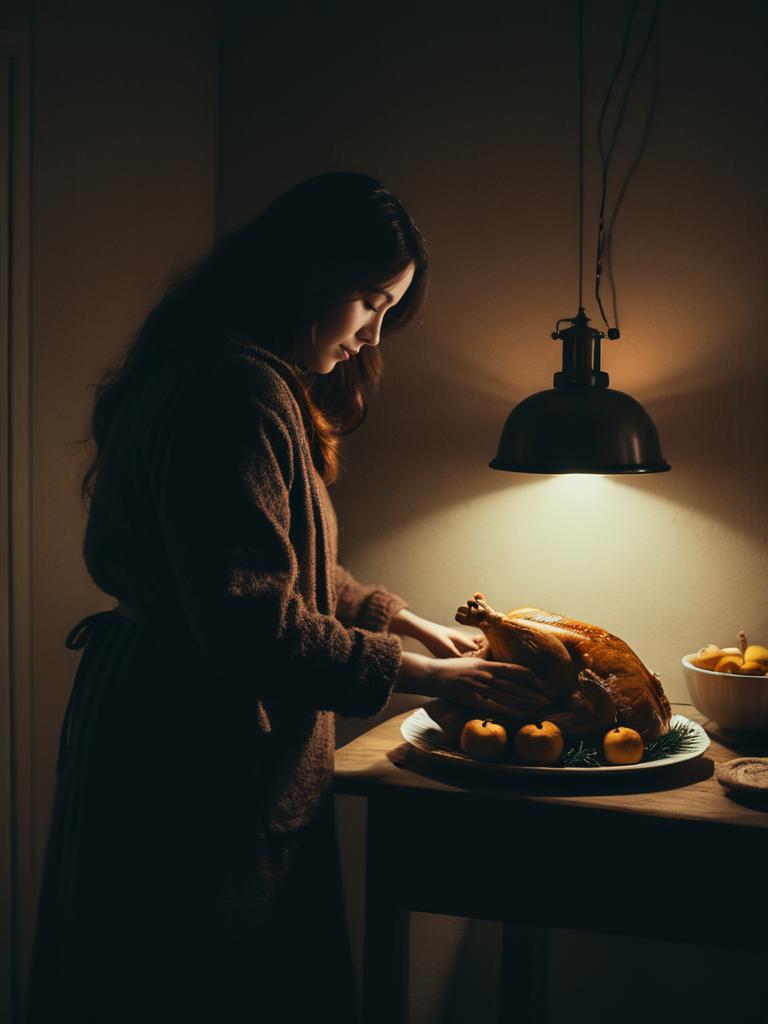 Woman Thanksgiving Outfit, woman in a thanksgiving costume preparing a turkey for a thanksgiving dinner --sref 1405
