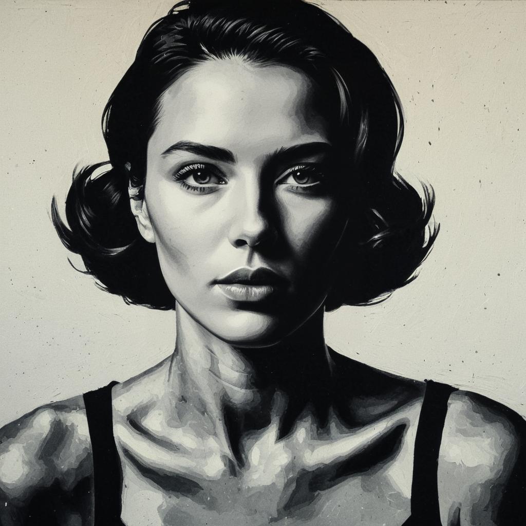 A striking black and white modernist style portrait painting depicting a young woman with defined facial features and short wavy dark hair. The artwork emphasizes contrast and texture, capturing detailed shadows and highlights on the woman's face and neck. She wears a sleeveless top, and the background features abstract, textured brush strokes contributing to the modern art aesthetic.