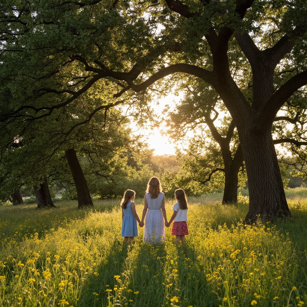 Golden sunlight filters through a tranquil forest clearing as three figures—a woman and two girls—stand hand-in-hand amidst vibrant yellow wildflowers, their silhouettes framed by the warm glow of the setting sun and the dark, sprawling branches of ancient trees.