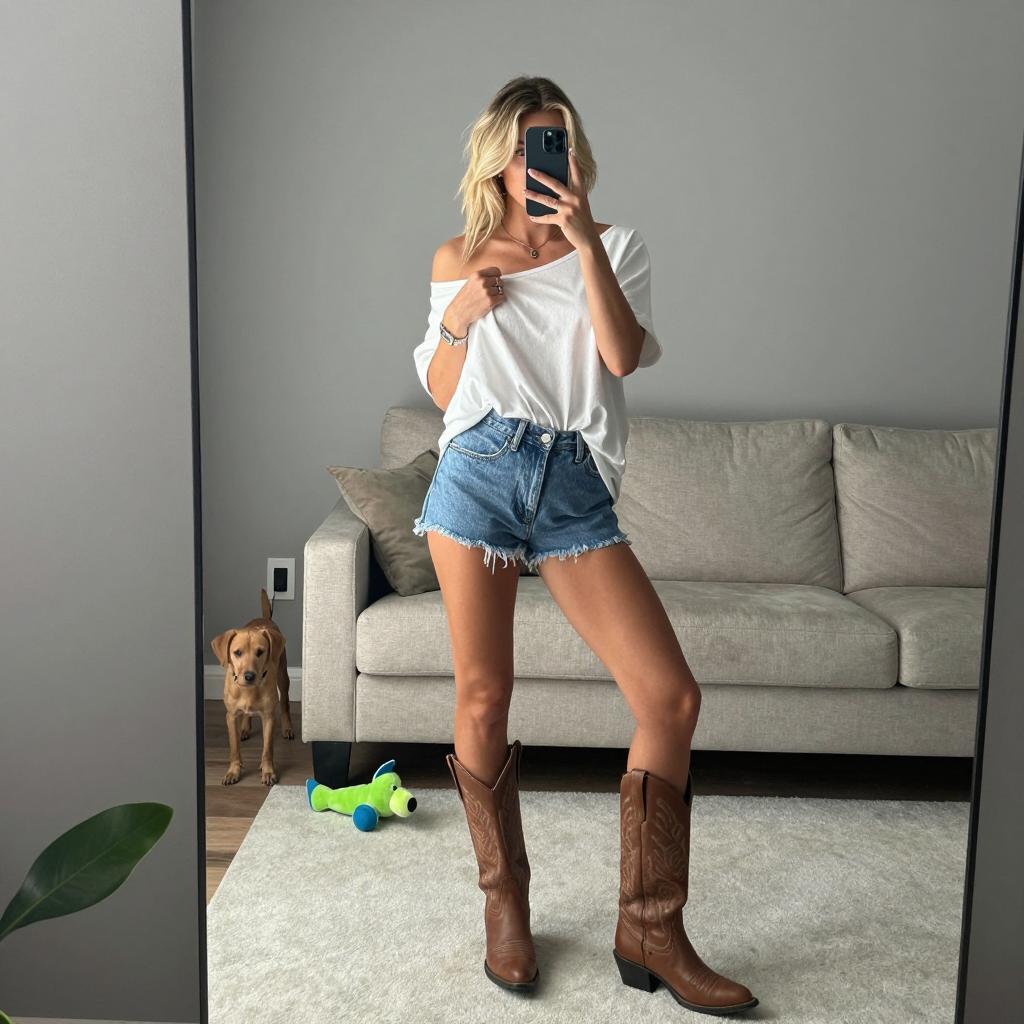 Photograph of a woman with long dark hair, wearing a black cowboy hat, white oversized t-shirt, and brown knee-high boots. She stands in a modern kitchen with stone walls, next to a large glass door, looking outside at a mountainous landscape. She faces away, hands by her sides. The kitchen has wooden cabinets and a white countertop. Sunlight streams through the glass door.