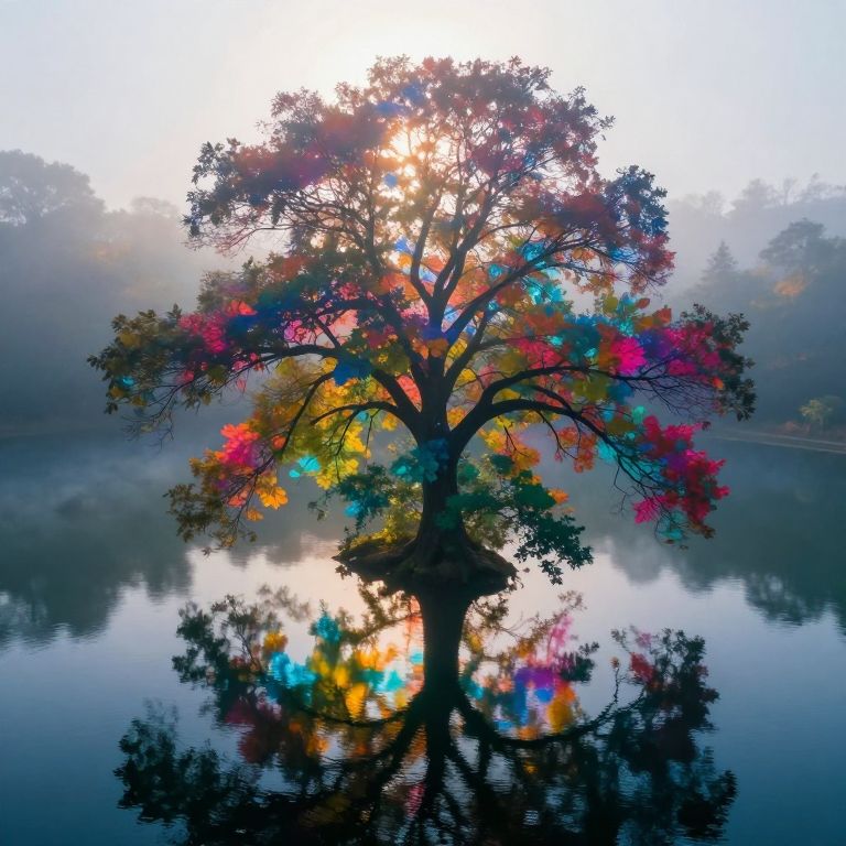 Photograph of a colorful, sunlit tree reflected in a misty lake, with vibrant red, yellow, blue, and purple leaves contrasting against the