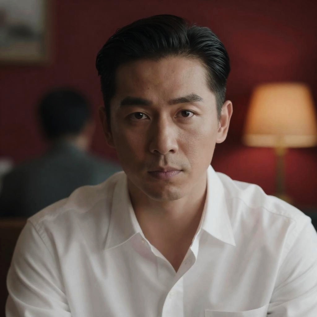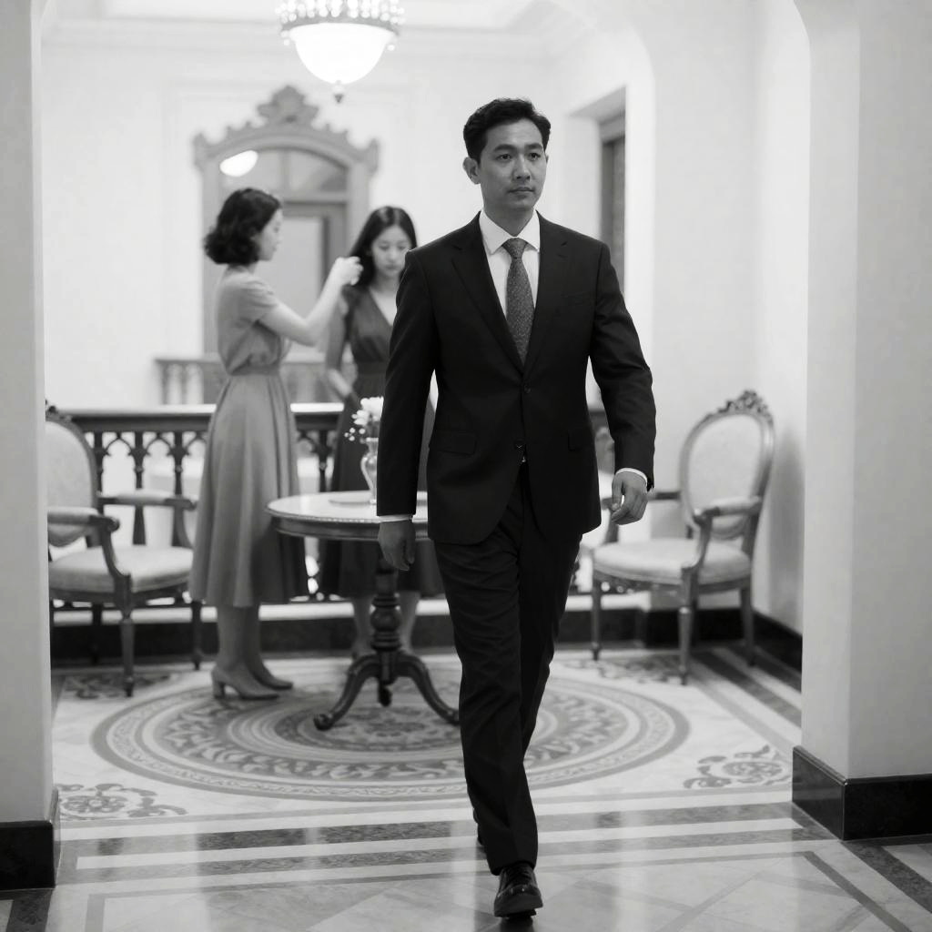 Black-and-white photograph. Man in suit walking downstairs, looking forward. Two women in dresses on balcony, one adjusting the other's hair. Ornate interior with circular rug, patterned floor, decorative chairs, and a round table with a vase.