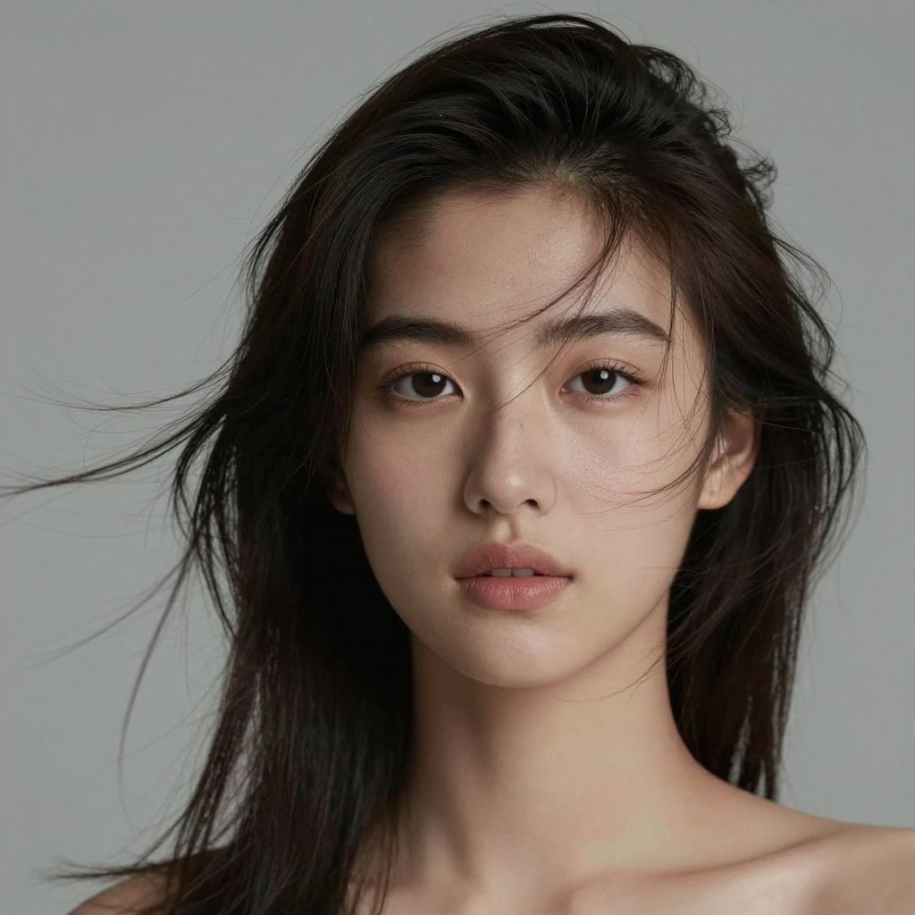 This is a high-resolution photograph of an East Asian woman with fair skin and dark, slightly tousled, straight hair that falls around her face. She has large, almond-shaped brown eyes, a small, straight nose, and full, natural pink lips. Her expression is neutral, with a slight hint of seriousness. She is not wearing any visible clothing, showcasing her bare shoulders. The background is a plain, light grey, which contrasts with her dark hair and light skin. The lighting is soft, highlighting her natural complexion and subtle makeup. The overall style is minimalist and modern, focusing on her natural beauty and facial features.