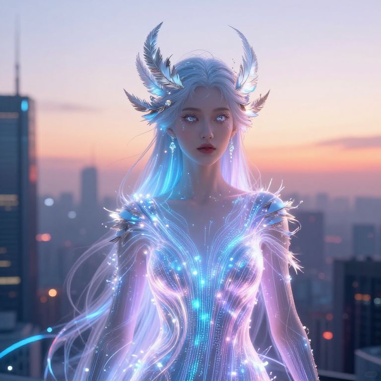 Ai generated goddess emerging from a futuristic cityscape at dawn, her form composed of luminous data streams and metallic feathers, serene expression with crystal eyes, blending advanced AI elements with classical goddess iconography, vibrant cyberpunk color palette
