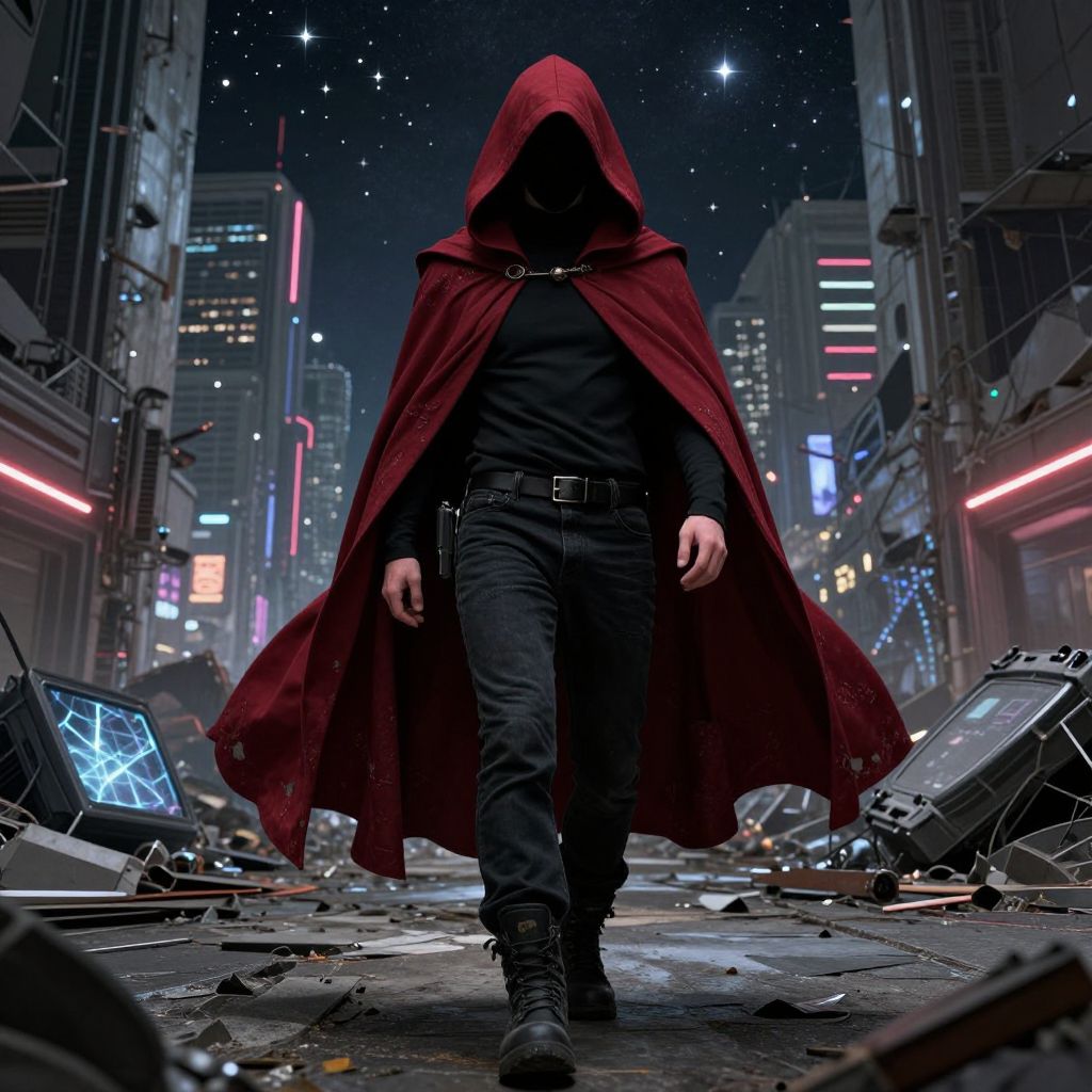 An intricately detailed illustration of a mysterious man walking directly toward the viewer through the streets of a ruined futuristic city, He wears a black turtleneck with long sleeves, black jeans, and rugged black military boots, A long, carmine-red hooded cape swirls behind him, its weathered texture adding a dramatic flair, His face remains largely obscured by the shadows of his hood, with only hints of his sharp jawline and faint eyes visible in the darkness, The city around him is a decayed wonder of the future, with broken buildings and flickering neon lights casting faint glows onto the cracked pavement, Scattered debris includes shattered screens and glowing remnants of advanced technology, Above, a starlit sky sparkles brilliantly, its celestial beauty contrasting with the desolation below, The overall mood is one of quiet strength and enigmatic resolve, with the man appearing as both a lone survivor and a figure of untold power