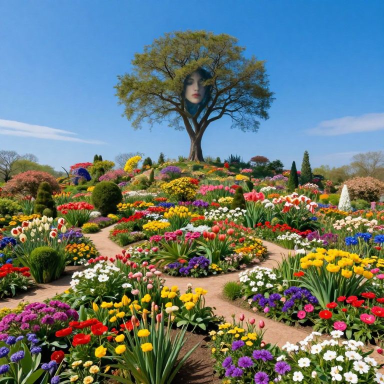 A surrealistic image depicting an infinite garden in full bloom, radiating vibrant colors and intricate details from a bird's-eye view. The scene transitions seamlessly into a vivid blue sky where a solitary tree stands, its branches artfully concealing the face of an enigmatic figure. This ethereal composition masterfully blurs the line between reality and illusion, evoking curiosity and wonder while showcasing nature's boundless beauty and mystery.